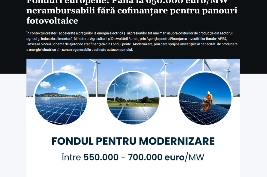 Fonduri europene: Până la 650.000 euro/MW nerambursabili fără cofinanțare pentru panouri fotovoltaice