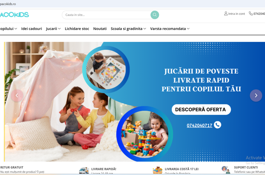 Se vinde magazinul online www.pacokids.ro, specializat în vânzarea de jucării pentru copii, cu aproximativ 1.000 de produse disponibile în stoc sau cu posibilitate de expediere în sistem dropshipping. Pachetul include: site-ul complet funcțional; paginile de social media (Facebook, Instagram, Pinterest); contul de Google Ads, cu o investiție de aproximativ 10.000 euro; contract dropshipping activ, cu expediere în aceași zi și termen de plată la 7 zile, furnizorul are peste 5000 de produse pe stoc. contract cu furnizor din Ungaria, cu marjă actuală de minim 50%. stoc de marfă în valoare de aproximativ 18.000 lei. Marja de profit pe ultimii 2 ani: 40% Preț de vânzare: 25.000 lei. NU se vinde Societatea