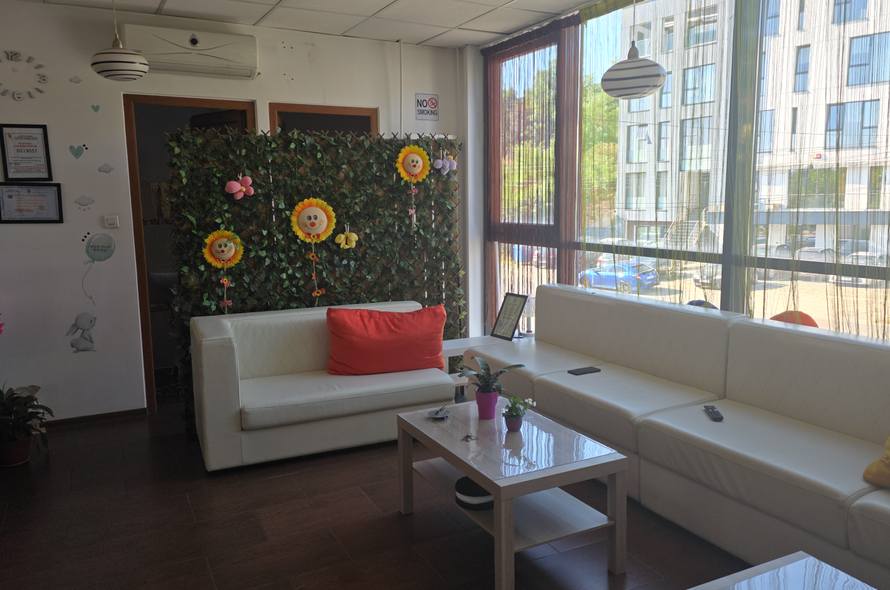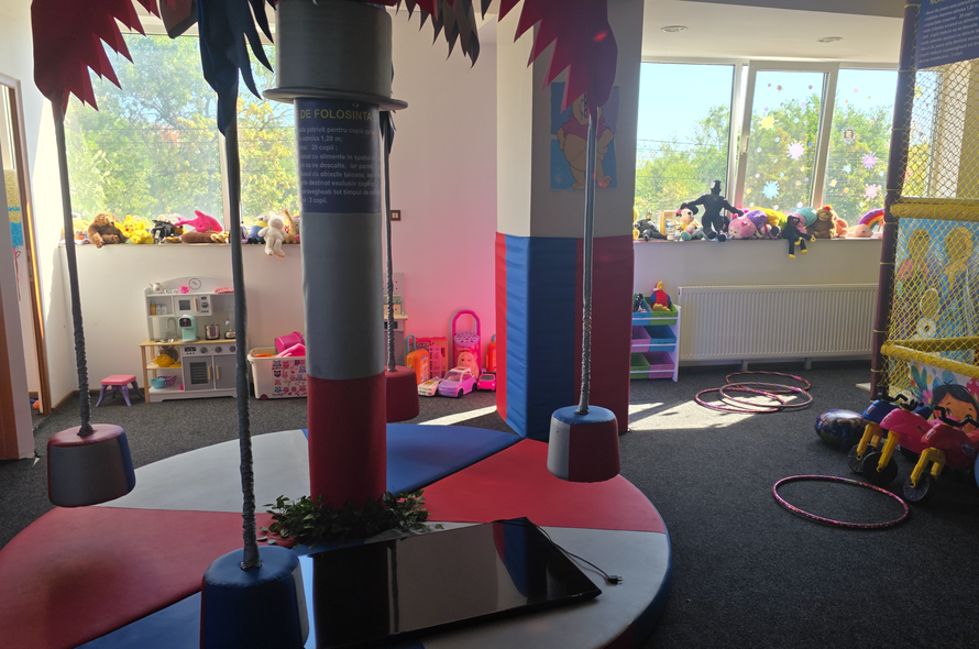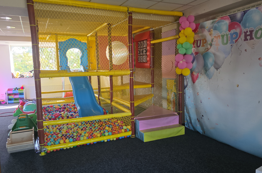 Cadru joaca cu bile , tobogane, leagan, carusel electric, casuta 2m/2m, biciclete, bile gonflabile, hăinuțe carnaval diferite personaje, 2 costume miky si minni, alte jucării, spatiu destinații părinților cu canapele din piele si măsuțe, spatiu destinat mâncării, spatiu de bucătărie utilata complet